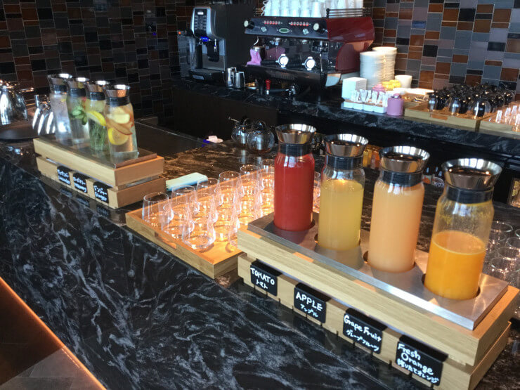 反対側一番奥(エッグステーションより奥側)にはフレッシュジュースやフレーバーウォーター(デトックスウォーター?)のコーナーです。ちなみにフレーバーウォーターとデトックスウォーターって定義が違うのでしょうか?どなたか教えてください(笑)。話を戻しますがこちらのボトルは注ぎ口が見当たらず右往左往しましたがそのまま傾ければどこからでも飲み物が出てくるようです。