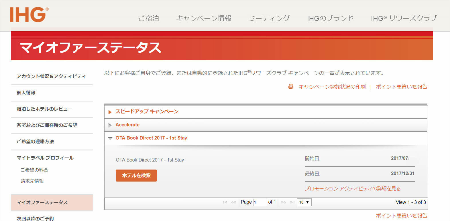 ところがある日突然マイアカウントのマイオファーステータスから突然このキャンペーンが消えました。おかしいなぁと思っていたところネット上で「OTA Book Direct 2017は8月1日に早期終了した」との噂が駆け巡りました…僕はこのキャンペーンでのポイントゲットのために無駄にホテルに泊まっただけにその噂が本当なら無駄なお金を払ったことになります(笑)。