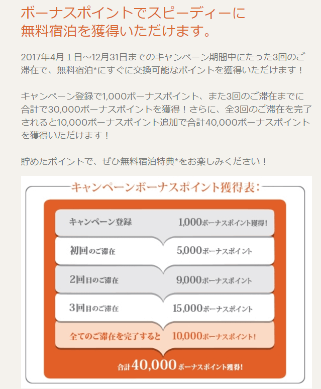 2017年4月1日~12月31日までのキャンペーン期間中にたった3回のご滞在で、無料宿泊*にすぐに交換可能なポイントを獲得いただけます! キャンペーン登録で1,000ボーナスポイント、また3回のご滞在までに合計で30,000ボーナスポイントを獲得! さらに、全3回のご滞在を完了されると10,000ボーナスポイント追加で合計40,000ボーナスポイントを獲得いただけます!