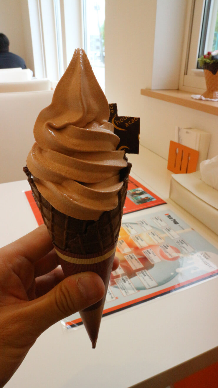 薄いチョコが2枚刺さっています。このチョコも美味しかったです。ソフトクリームは最初の一口は濃厚なチョコの風味が来ますが、食べ続けると見た目よりチョコの感じは控えめ、甘さも控えめであっという間に完食しました。