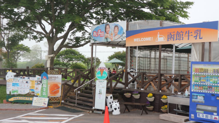 函館駅付近からはかなり遠いです。いろいろあってレンタカーを借りたので訪れてみました。函館駅付近から見ると函館空港を過ぎた丘の上にあります。僕は海沿いの道から行ったので空港の滑走路をくぐっていく形になりました。僕が宿泊したラビスタ函館ベイの朝食でも出されていた函館牛乳の工場内にある直営店のようです。