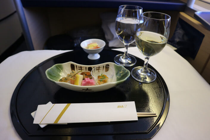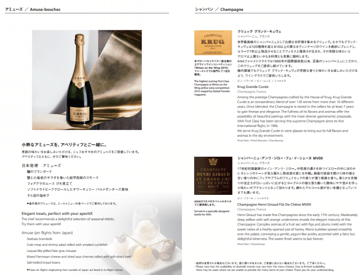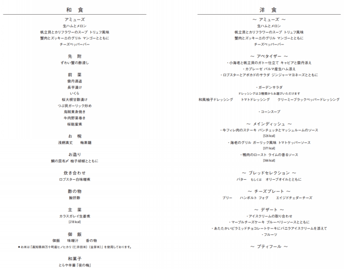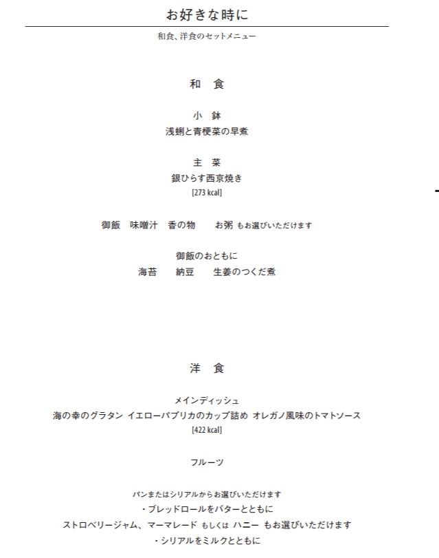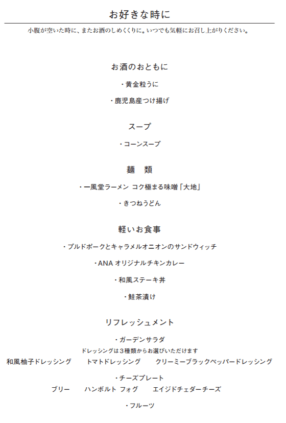 ファーストクラスはビジネスクラスのようにいつでも以下のメニューが注文できます。