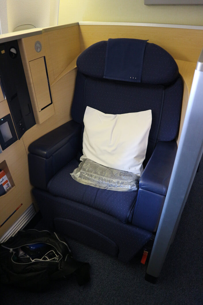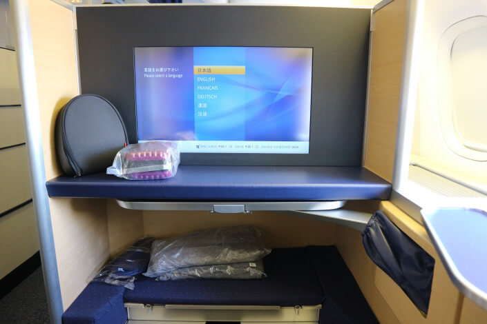 シートの上にはビジネスクラスのように全てがどーんと置かれているのではなく、クッションと毛布のみが置かれています。