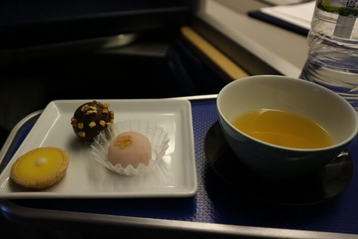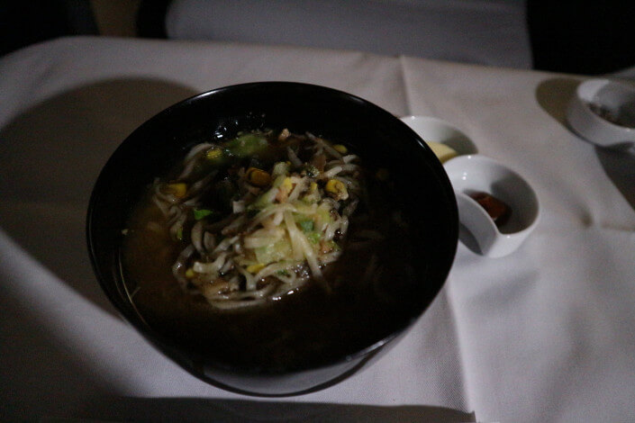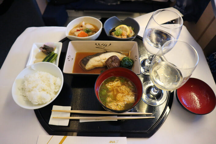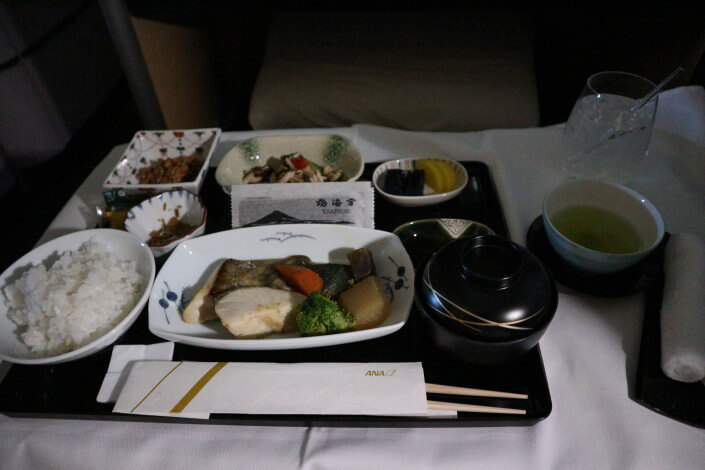 久しぶりの御飯と味噌汁がとても美味しかったです。 魚はパサつきが気になり残念ながらイマイチでした… やはりアメリカ発の機内食の和食は日本で食べる和食とは繊細な味覚と言う点で及ばないなあと思いました。次回ファーストクラスに乗る機会があれば(人生に1回あるかどうか…)洋食にしてみようと思います