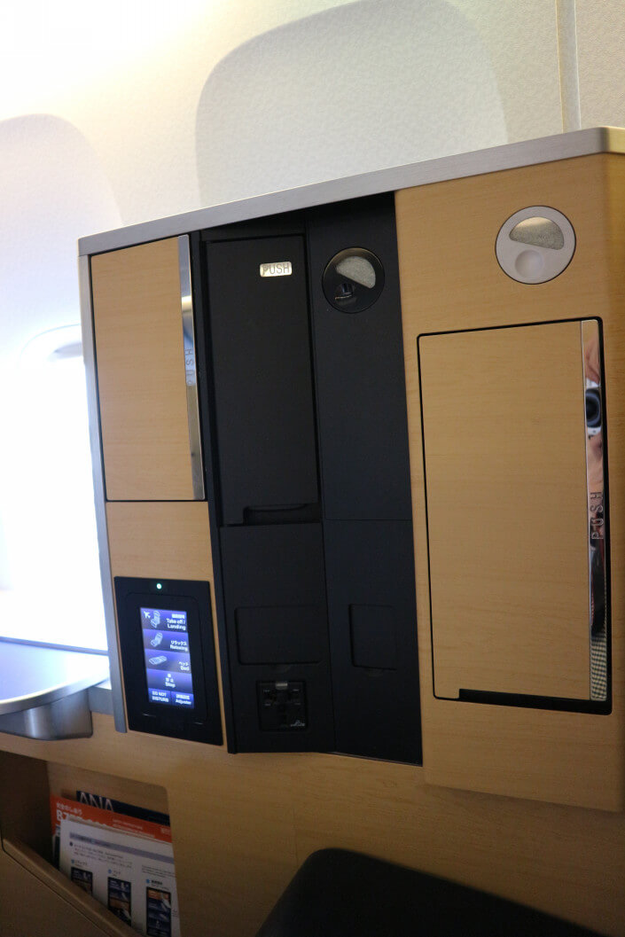 スマホ、充電器、ヘッドホン、めがね、新聞、筆記用具など長距離フライトでは身の回りのものが多いので、置く場所や収納が多いのはありがたいです。