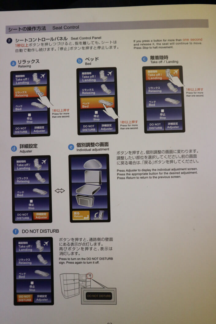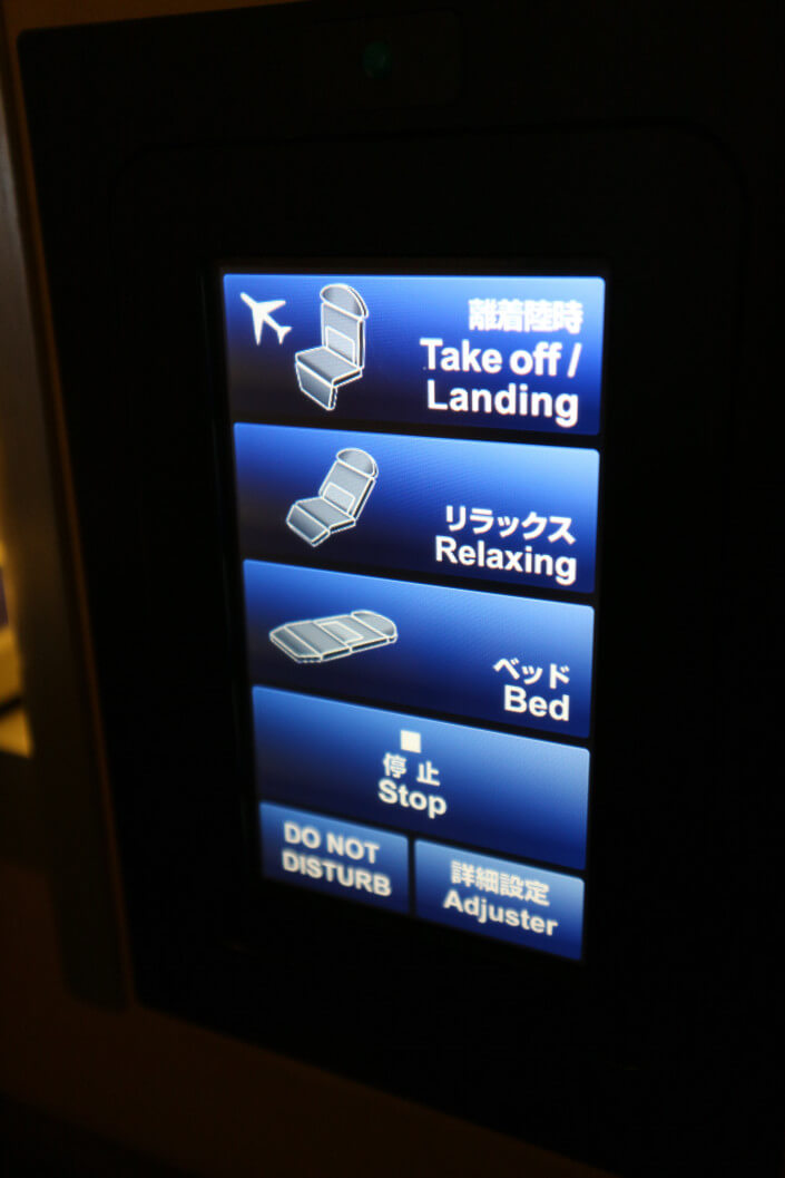 離着陸時、リラックス、ベッド(フルフラット)はワンタッチで、ヘッドレストやレッグレストを細かく自分好みの角度にしたければ詳細設定で自由に操作可能です!DO NOT DISTURBボタンまであります。