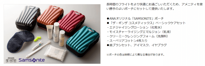 アメニティーはSAMSONITEのポーチに入っている「ザ・ギンザ コスメティックス」のものです。ポーチは未開封ですのでポーチの中身についてはANAのホームページから拝借した以下の画像の通りです。