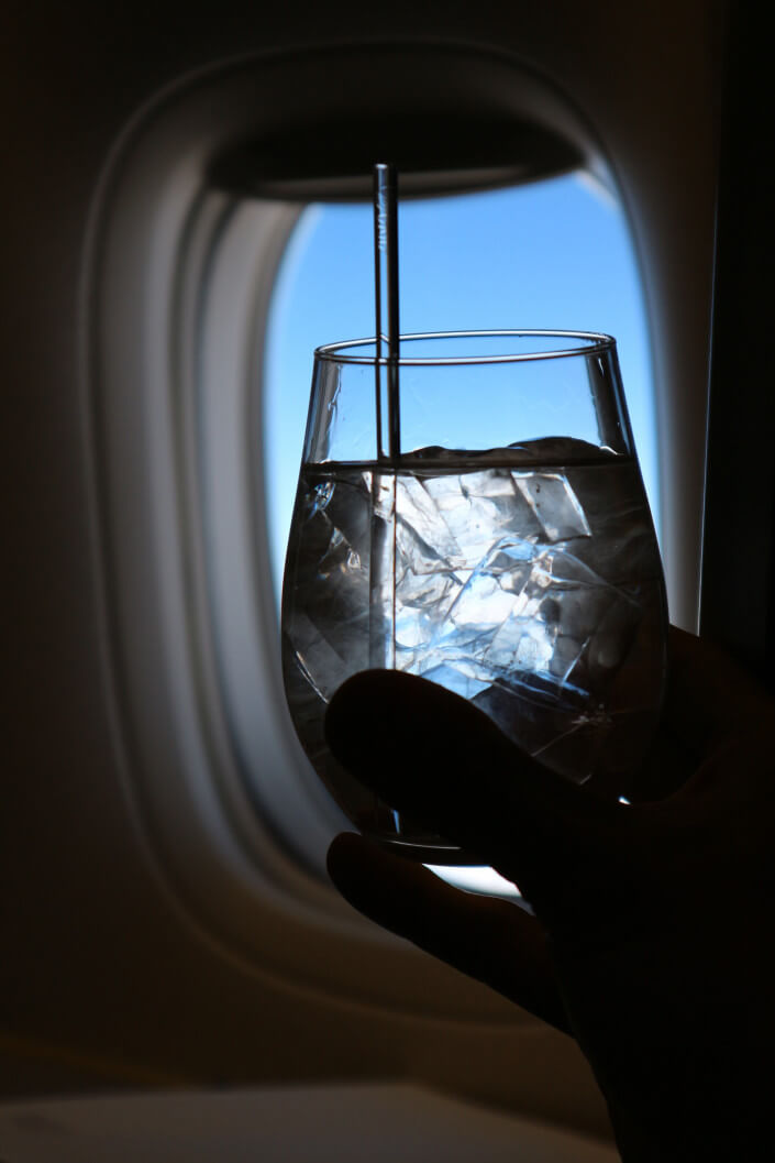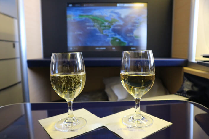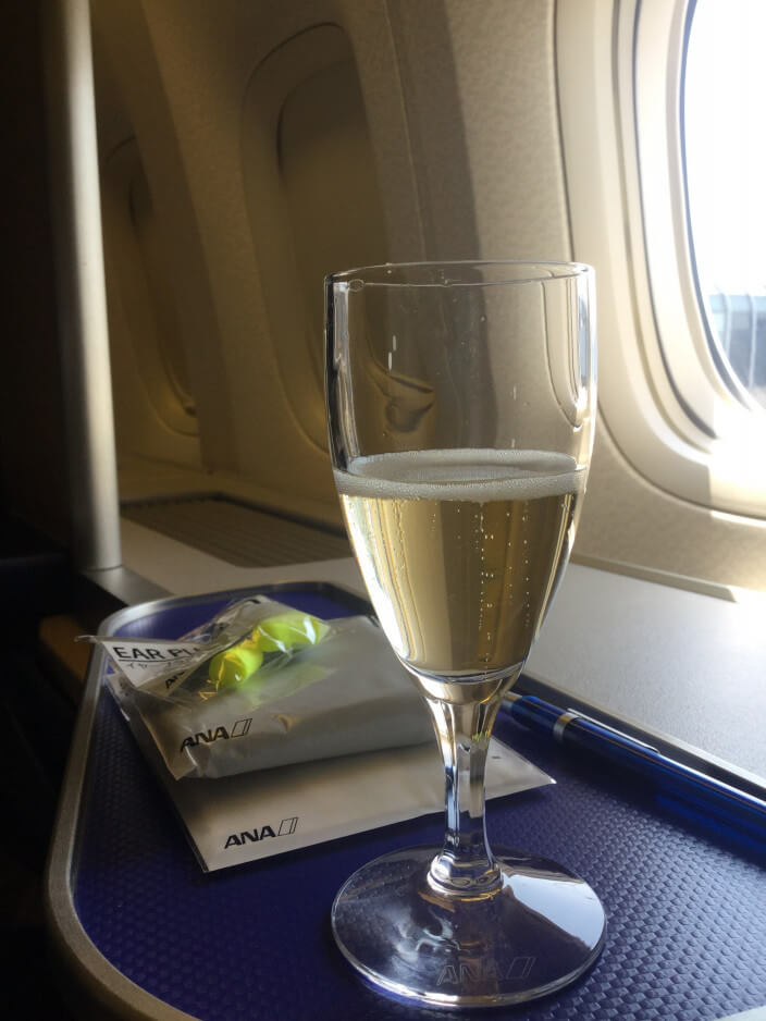 まずはウエルカムドリンクのシャンパンを頂きます。皆さんのようにきれいに写真撮れませんでした… そしてファーストクラスは窓までの距離が遠くて座ったままでは景色が見にくいです
