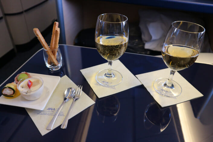 離陸後まず飲み物を聞かれます。もちろん飲みたかったシャンパンをお願いします。2種類とも飲みたかったのでお願いしました。
