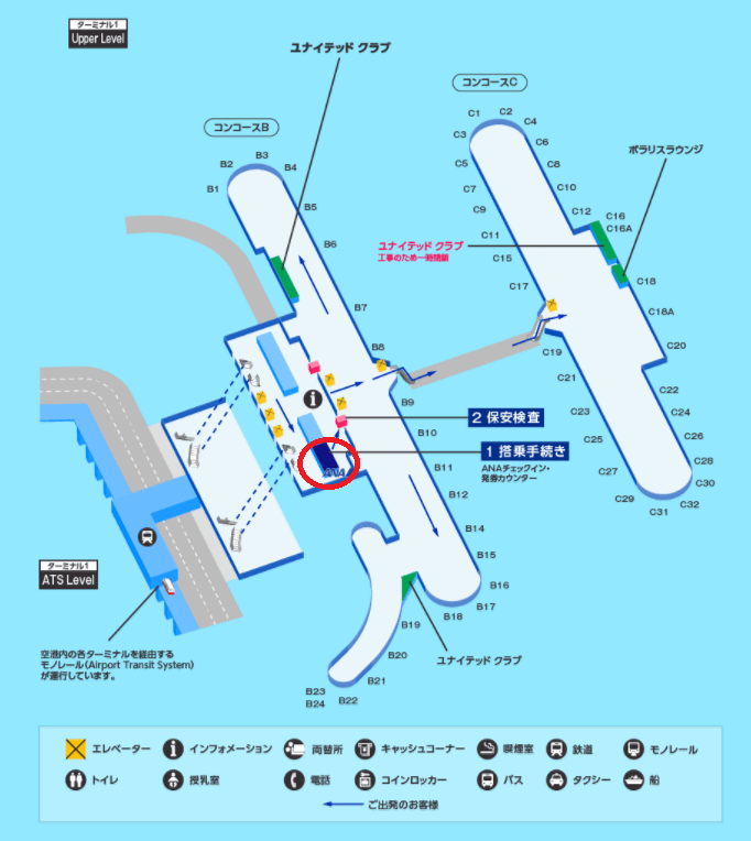 チェックインカウンターはすでにオープンしていて大行列でした!隅っこにある案内を見ると8時45分オープンとの記載がありました。 なぜか5分だけ早いようです。大行列を横目にファーストクラスカウンターで受付です。学会最終日翌日ということで見知った顔が何人か並んでおり、「なんであいつはあそこで受付しているんだ」みたいな視線を受けて少しやり辛かったです。