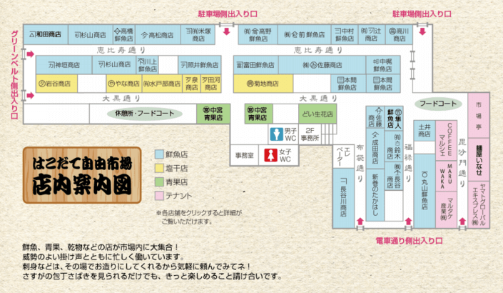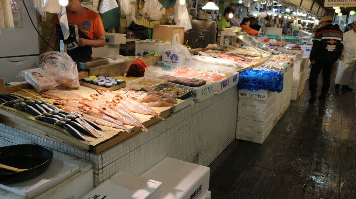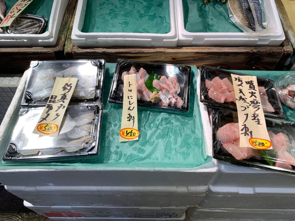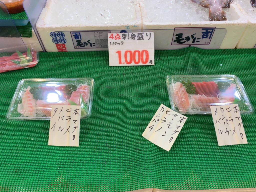 またしつこい客引きもなくゆっくり品定めができます(笑)。 イートインコーナーもあり、市場で買ったものを食べるスペースがあり、はしと醤油も置いてあります。イートインに手頃な刺身盛り合わせを置いているお店もありますよ!