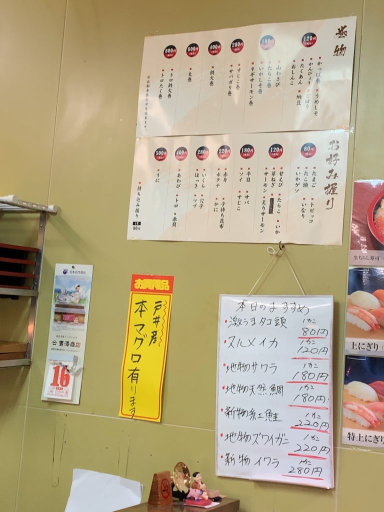 メニューとお値段はこんな感じです。にぎりは80~500円、巻物は120~800円とリーズナブルですが結構本格的でコストパフォーマンスはよいと感じました。