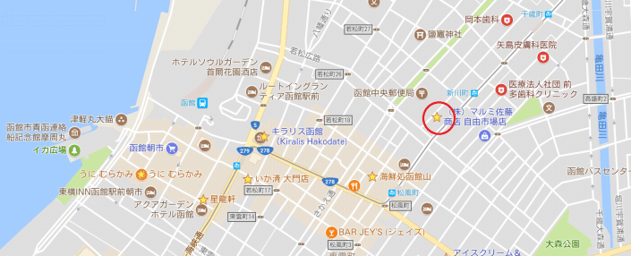 函館駅から歩いても10分ちょっとで着きますし、市電「新川町」電停の目の前です。アクセスもとても便利です。 下の地図赤丸の場所です。