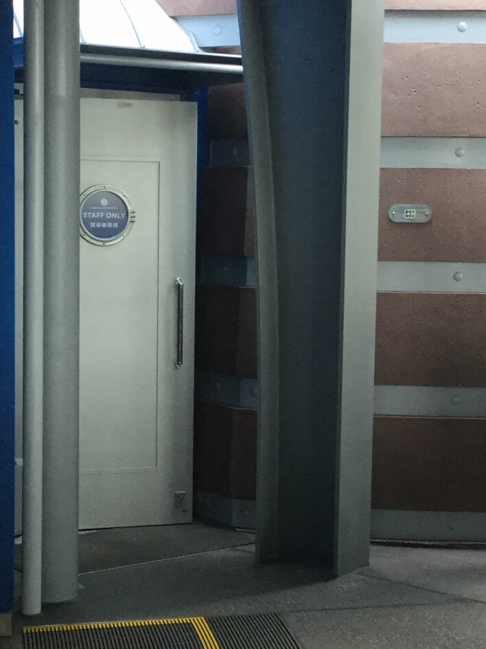 ラウンジを予約していることをアトラクションのキャストに伝えるとアトラクションの入り口近くまで案内されます。 下のようなアトラクション入り口横の扉から中に案内されます。小さくJCBのマークが扉の横にあります。