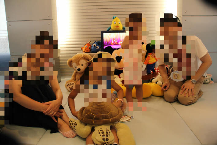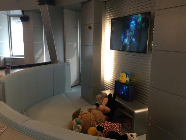 小上がりのキッズスペースのテレビでは、ディズニー映画が上映されていました。子供たちはここでぬいぐるみで遊んだりテレビを見たり楽しんでいました。