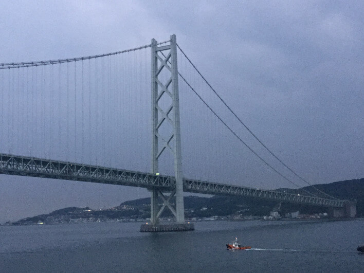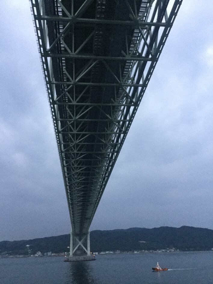 朝は早起きしてデッキに出ます!真夏で暑いはずですが海の上は心地よい風が吹いていて気持ちいいです。そして明石海峡大橋をくぐります。下から見るとすごい迫力!