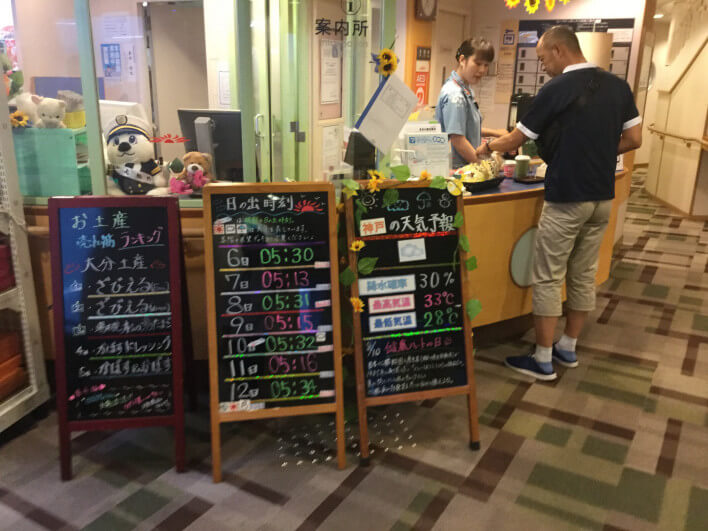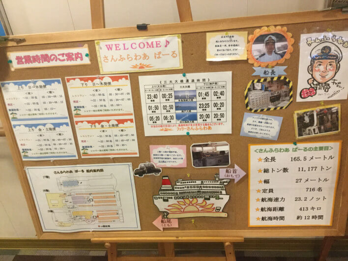 その向かい側には船長さんや船の紹介などウエルカムボード的なものもあります。三大大橋の通貨予想時刻も掲示されています。