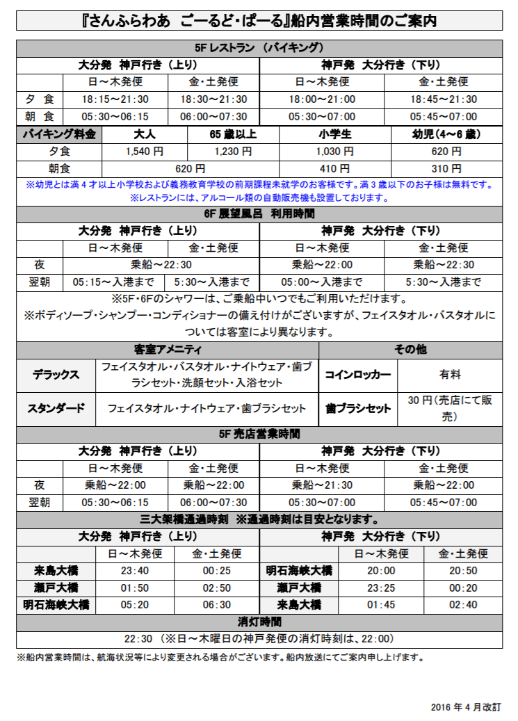 飛行機のマイレージのようなものとして「Clubさんふらわあ」というものもあります。スタンプを貯めると船内の食事や乗船券と交換できます!また運賃20%OFFなどの特典もありますので頻回に乗船される方は是非ご入会下さい