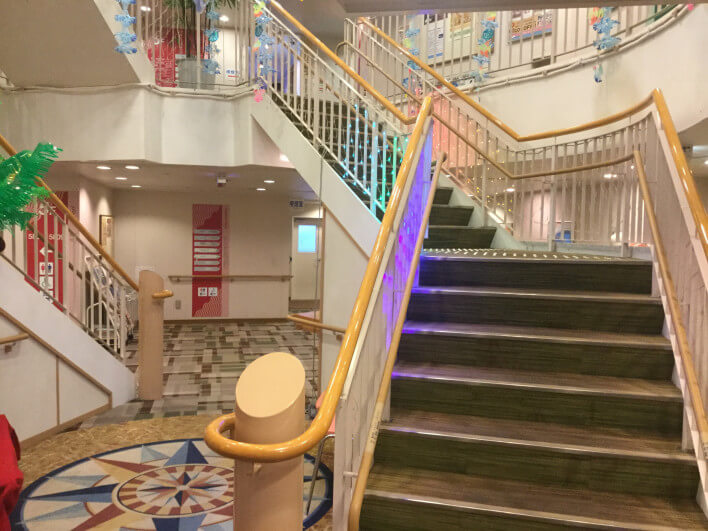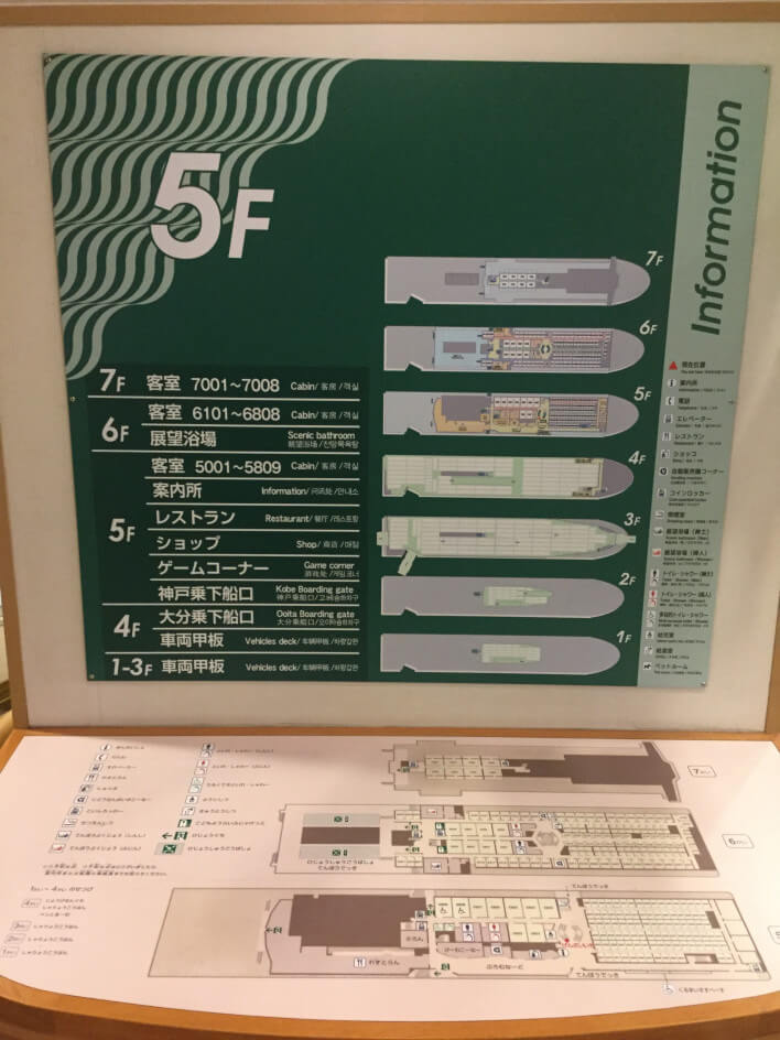 船内は車両甲板を含め7層になっており、客室は5〜7階の3層です。展望浴室は6階にありますが、それ以外パブリックスペースは5階にあります。