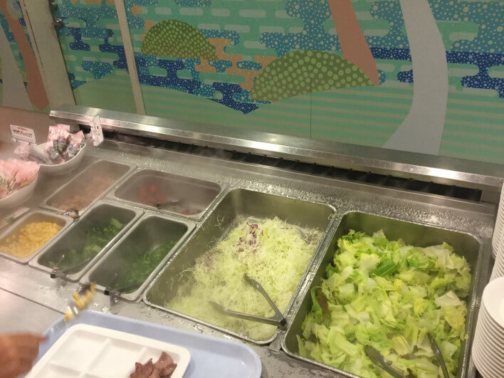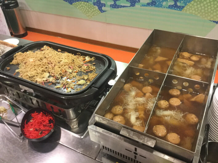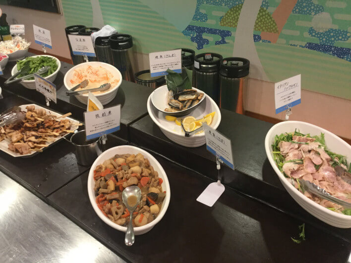 レストランに向かいます。夕食はバイキング形式で大人1540円です。アルコールは生ビールは少々高いですが、缶ビールや缶チューハイは自動販売機でお手頃な価格で購入できます。