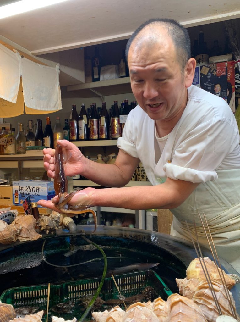 マスターが生簀から出して見せてくださった後、調理されます。 ぴくぴくとまだ動いている間に頂きます。