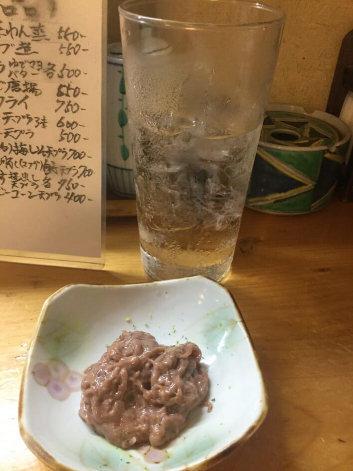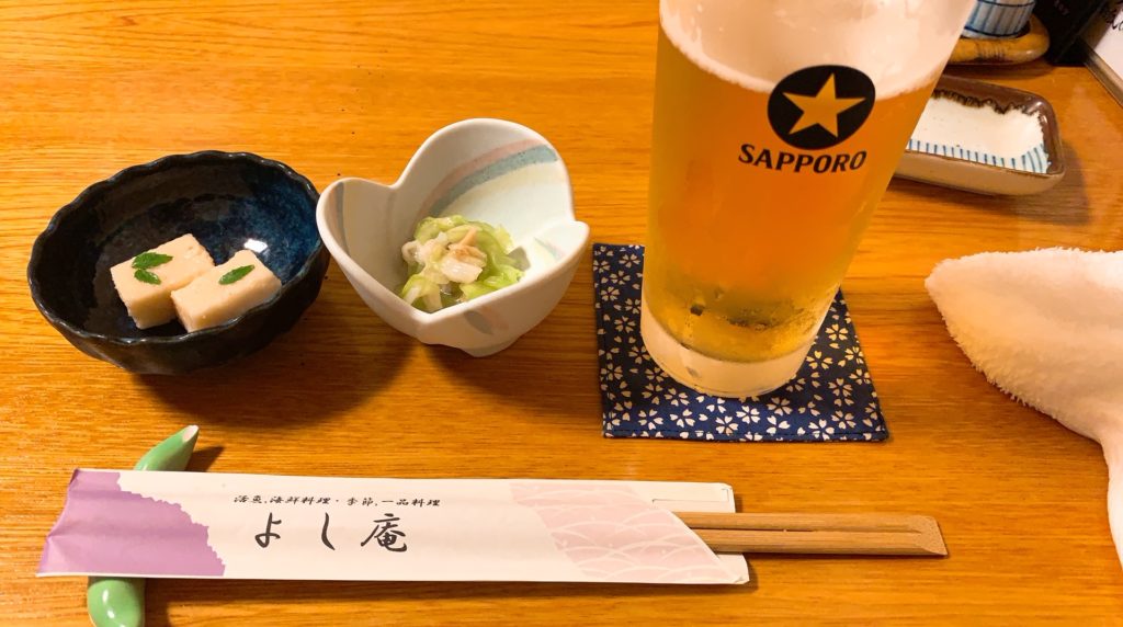 入るなりマスターが「今日は予約でいっぱいなので料理出すのが遅くなるけどいい?」と言われます。こちらは仕事も終わり翌日帰るだけで何にも用事がなくちびちび飲みながら函館の海鮮を堪能したいと思っていたところなので思うところです!