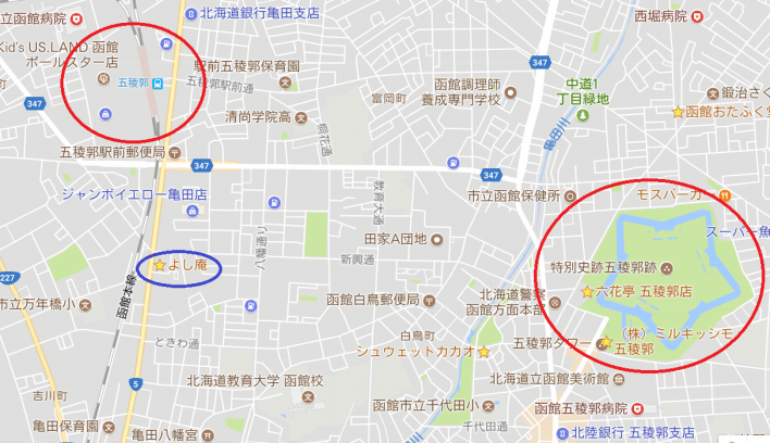JR函館駅からJR五稜郭駅に向かう途中の国道5号線沿いです。左上赤丸印の五稜郭駅からは歩けないわけではない範囲ですがタクシーで向かうのがいいと思います。函館駅周辺から1000円前後です。有名なようで店の名前を言うだけでOKでした 。ちなみに右側の赤丸が有名な五稜郭ですがJR五稜郭駅からは離れているのでやはり徒歩での移動は無理そうですのでご注意ください。