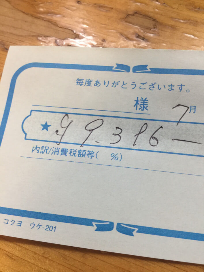 お会計は以下の通りです。活イカ、活北寄貝、盛り合わせなどなどお刺身をたらふく頂いて、焼酎ボトル1本入れた割にはリーズナブルです