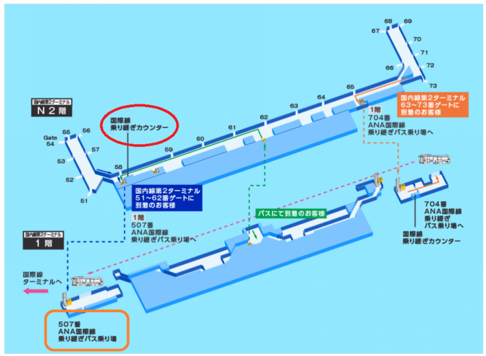 今回福岡から国際線に乗り継ぐのは僕一人だったようで僕だけ他の方々と逆方向に進むのですごく心細くなりました。今回僕は60番か61番ゲートに到着したので下の地図の赤丸の58番ゲート前の国際線乗り継ぎカウンターに向かいます。
