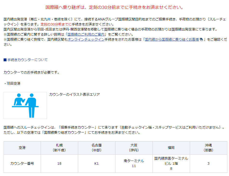 ・ 国際線乗り継ぎ手続きは定刻の30分前までに必要