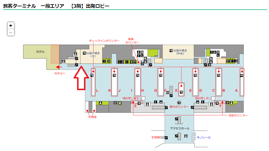 案内に従い自動ドアを出ると国際線ターミナル3F出発ロビーのLカウンター付近に出たようです。下の地図の大きな赤矢印の場所です。