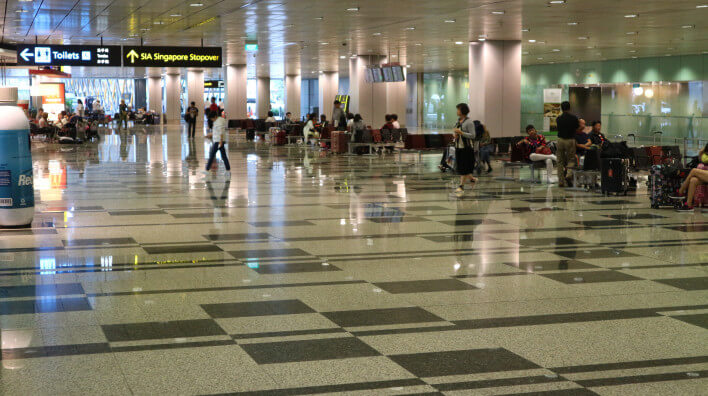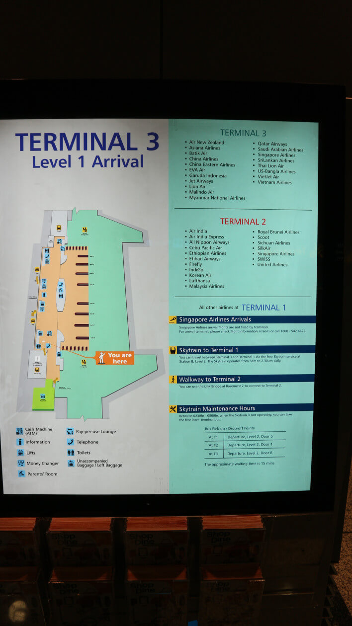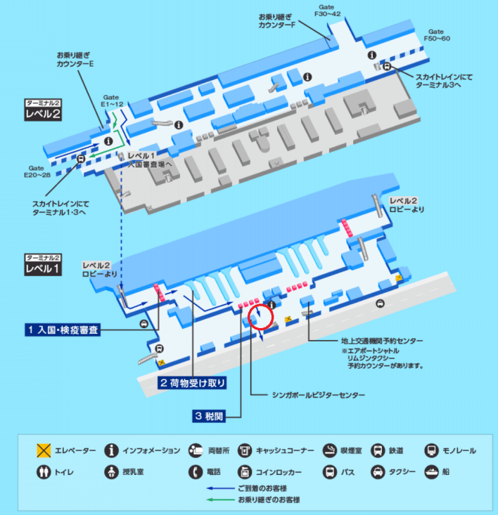 ANAの案内を見ますと入国審査、税関を通って上の地図の赤丸の場所に出ます。下に示すチャンギ空港の地図で同じ場所に赤丸をつけます。