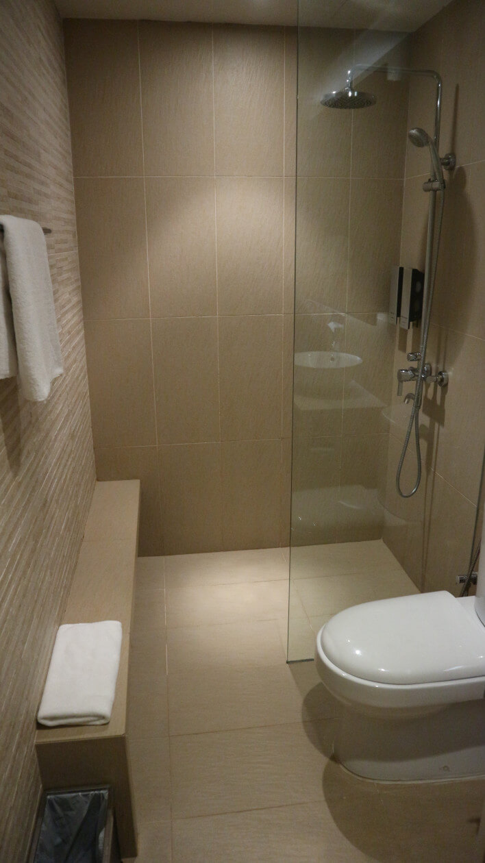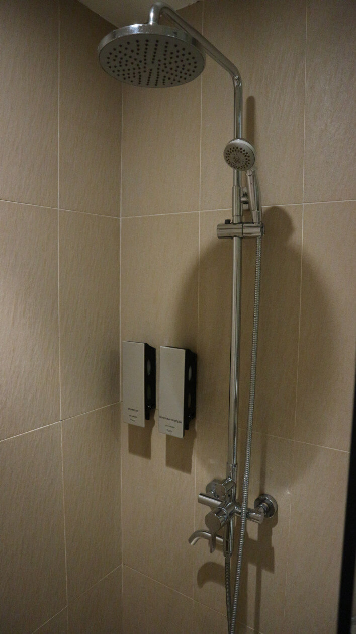 清潔感がありきれいなシャワールームです。手持ちのシャワーはホースから水漏れがして十分な水量が得られなかったので天井から浴びるタイプのシャワーで汗を流します。こちらは全く問題ありません。