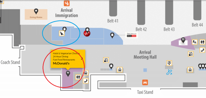 T3の地図を拡大した下の地図で赤丸がマクドナルド、青丸が目指しているラウンジThe Havenです!