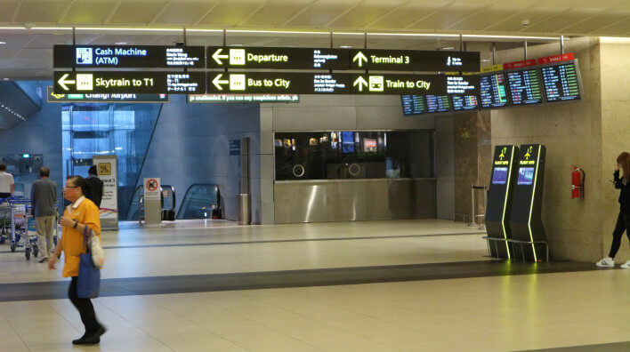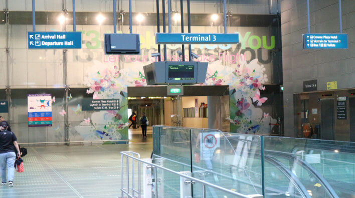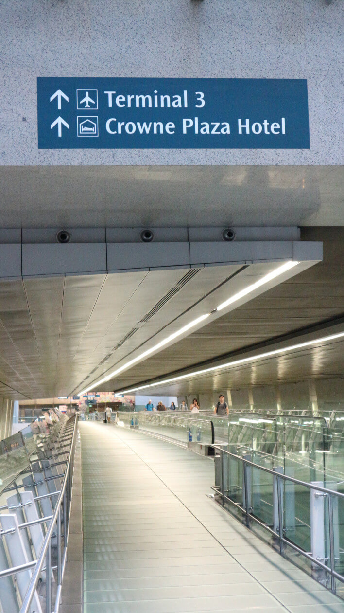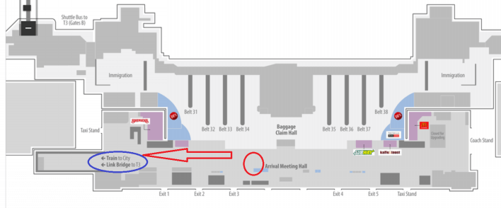そこから赤矢印の方向に向かっていくと青丸の「Train to City」「Link Bridge to T3」の表記がありますね。実際の写真で青丸あたりの場所を見てみます!当たり前ですが直進の矢印には「Terminal 3」「Train to City」の表記があります。写真の左側に写っているエスカレーターで地下に降ります。