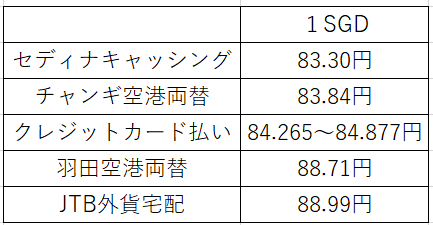 シンガポール街中の両替商での両替が一番レートが良かったという報告もあります。長期滞在するのであれば街中の両替商で両替するというのもありだと思います。ただし、現実的には、街中へ行くまでにシンガポールドルの現金が全く無いのは好ましくないと思いますし、経験上街中の両替商はレートの差があることが多いので事前に情報を入手された方がいいかと思います。
