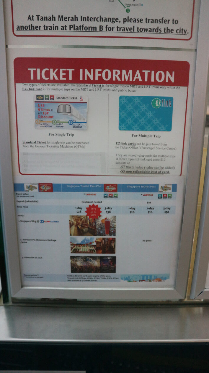 MRTだけでなくバスにも使えるプリペイド式のチケットです。券売機でチャージができるのでイメージとしてはICOCAやSUICAのような感じですかね。ICOCAやSUICAのように乗車ごとに自動的に運賃が引き落とされます。 料金は12SGDしますがカード代が5SGDで、実際運賃として使えるのは7SGDのようです。しかもカード代は返却されないので観光客には向いていないと思います。