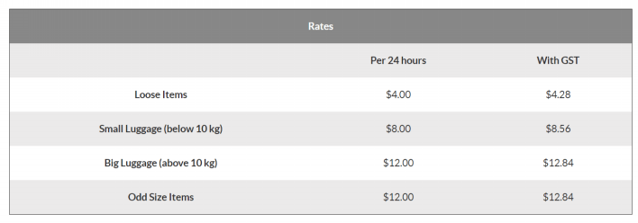 4種類に分類されるようです。小さな荷物なら4SGD、大きいものでも12SGDです。その後は24時間ごとに料金が加算されます。僕は小さなスーツケースでしたので8SGD+税でした。小さなカバン程度ならLoose Itemsに分類されるようです。