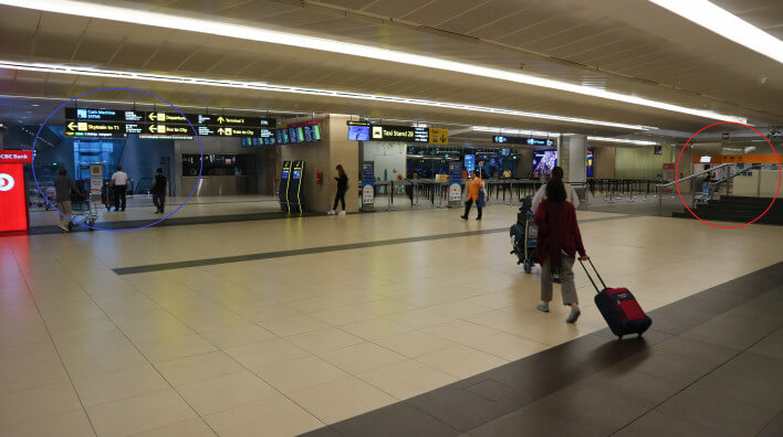 ここで右手を向くとオレンジのブースが見えます。下の写真の青丸が上の写真のエスカレーター、赤丸がオレンジのブース、手荷物預かり所です。
