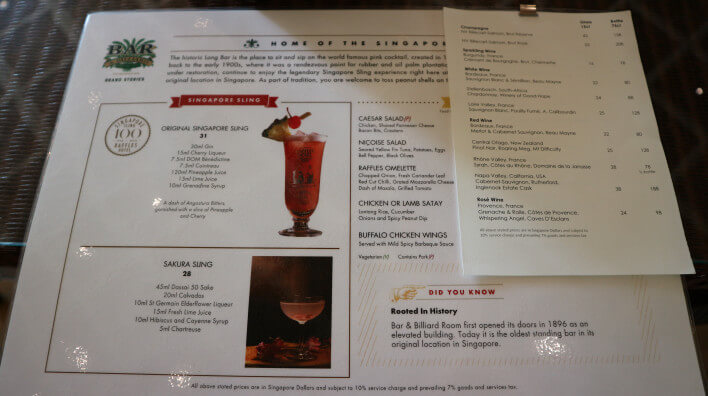 本来は「ロングバー」で提供されているシンガポールスリングですが現在は上記のように「バー&ビリヤードルーム」で提供されています。