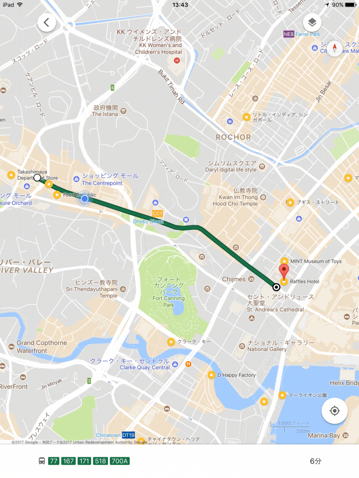 高島屋の近くからラッフルズホテルまでの経路をGoogle Mapで検索するとバスですぐ着くようです。Google Mapはやはりとても便利です!
