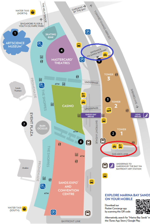 僕が到着して入ったのは上の地図の赤丸のTower1側でした。スカイパークの入り口は上の地図の青丸のTower3側だったのです。