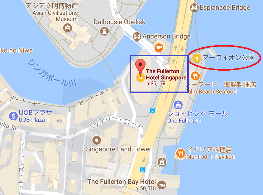 フラトンホテル(下の地図青い四角)からマーライオン公園(下の地図赤丸)はとても近いです。一見、道路を横断すれば到着するように見えますがこの道路は横断できません。