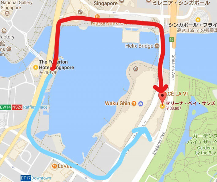 雑な図で申し訳ないのですが僕はマーライオンから青い線の方向に歩いていきました。Tower3側なら赤線の方向から回った方が近かったです。ちゃんと調べておけばよかったです…