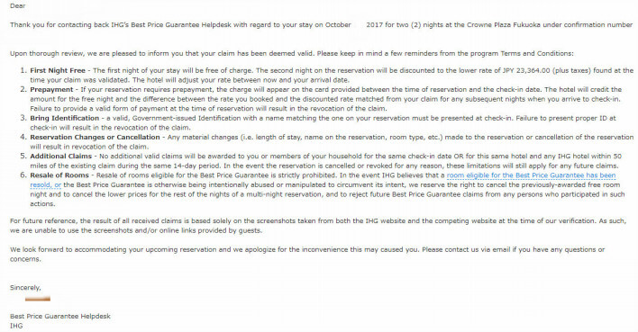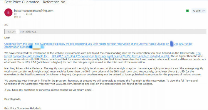 ベストプライス保証が適用されるとIHGではなんと初日の宿泊料金が無料になります。