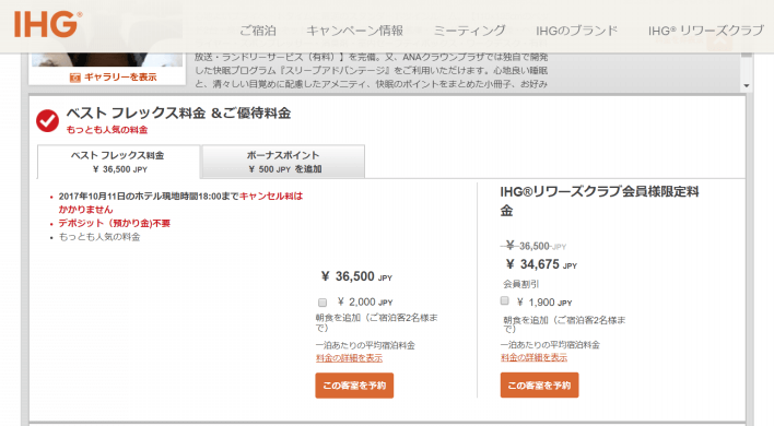 先ほどチェックしていたキャンセル料がかからないIHGリワーズクラブ会員限定料金のプランを予約!