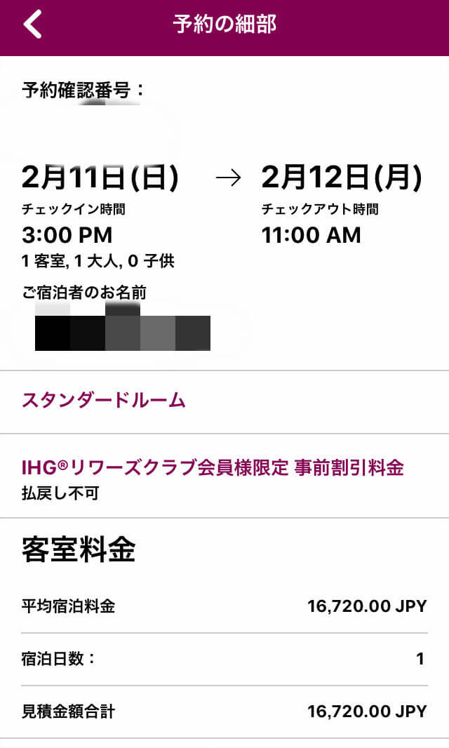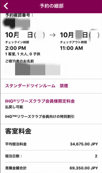 IHGのウェブサイトは通常であれば以下のように予約した内容が表示され料金が表示されます。