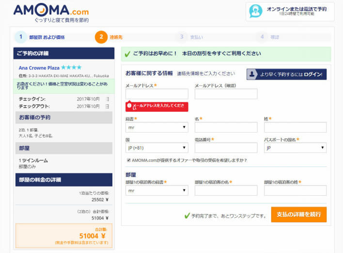 「1泊目はタダ!2泊目は23364円+税だよ」とのことです!これならビジネスホテルに宿泊する値段と変わらずANAクラウンプラザに宿泊できます!