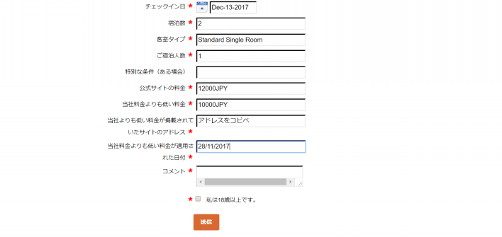 「当社よりも低い料金が掲載されていたサイトのアドレス」の記入欄は短いので今回であれば「https://www.amoma.com/」だけを記入しました。
