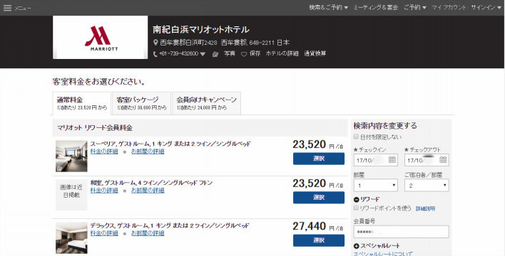 先ほどチェックしていたキャンセル料がかからないマリオットリワード会員限定料金のプランを予約!